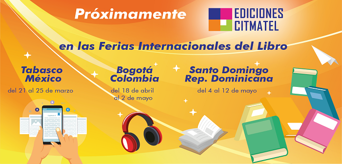 Durante los próximos meses la Editorial Citmatel estará participando en las Ferias Internacionales del Libro de varios países de Latinoamérica: en Tabasco, México, del 21 al 25 de marzo; Bogotá, Colombia, del 18 de abril al 2 de mayo y Santo Domingo, República Dominicana, del 4 al 14 de mayo.