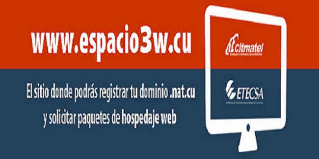 CITMATEL y ETECSA ponen a disposición de las personas naturales interesadas en hospedar un sitio web en Cuba, la página www.espacio3w.cu, a través de la cual podrán solicitar el registro de dominio y las capacidades de hospedaje web.