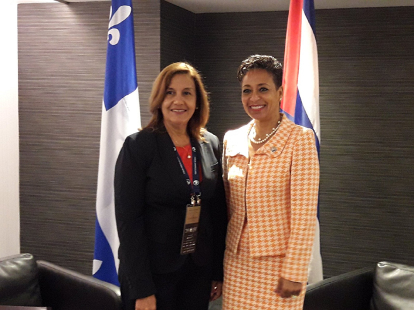 Elba Rosa Pérez Montoya, Ministra de Ciencia, Tecnología y Medio Ambiente (CITMA), tuvo un encuentro este lunes con Nadine Girault, titular de Relaciones Internacionales y la Francofonía de Québec, dentro de la visita que hace la funcionaria cubana a Canadá para asistir a la edición 25 del Foro Económico Internacional de las Américas, que se celebra en la ciudad de Montreal.